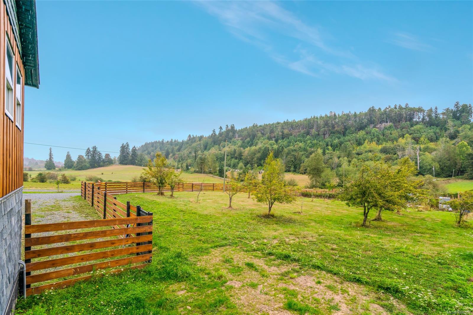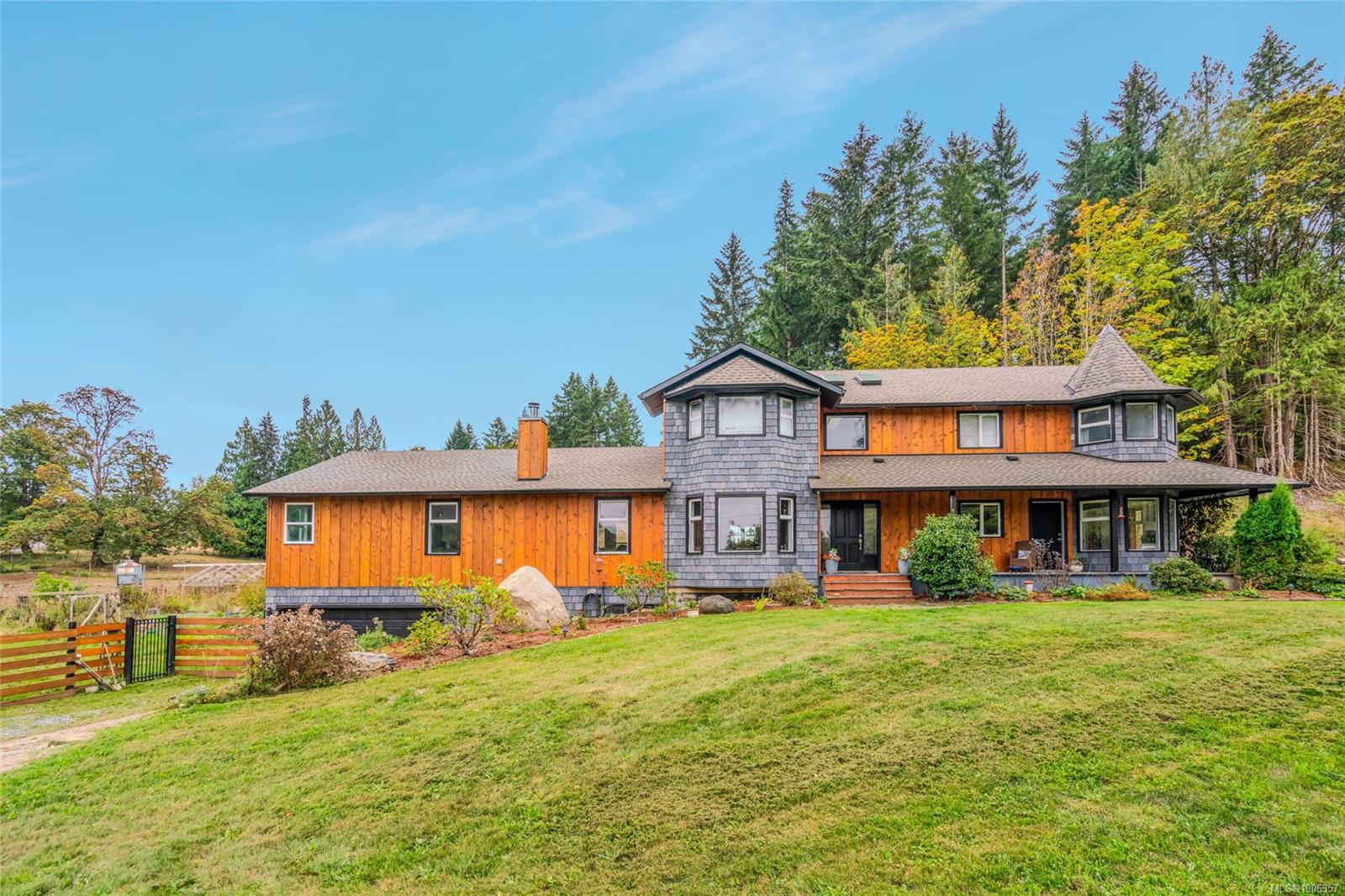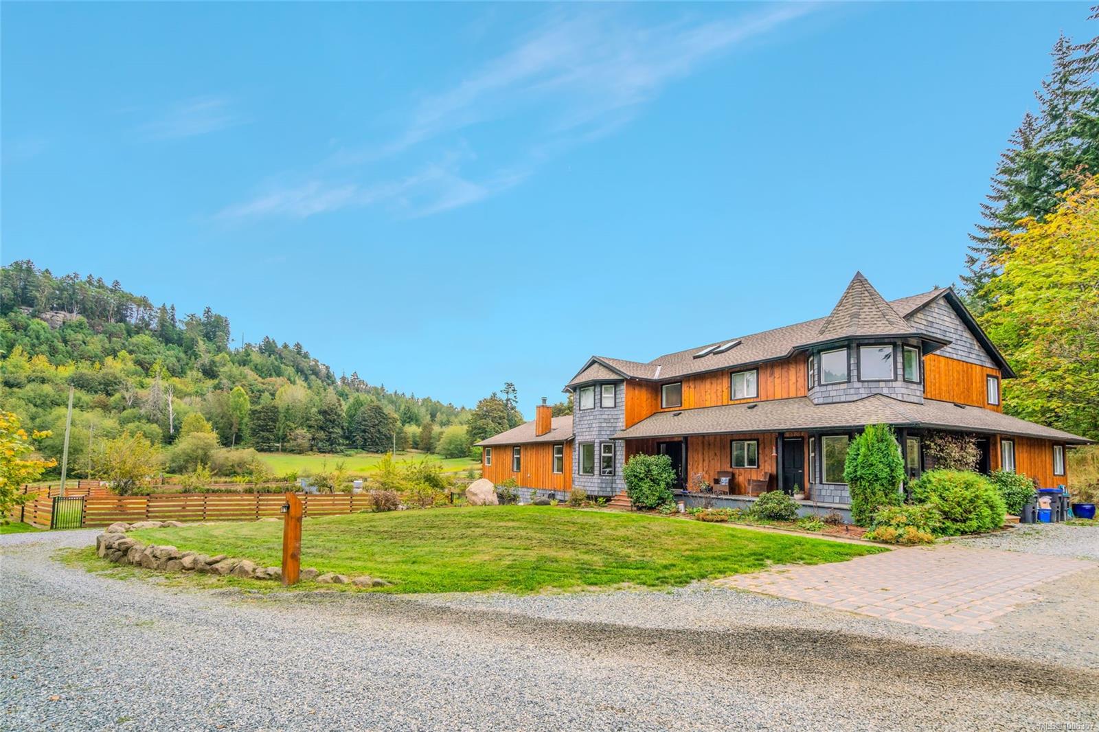 Discover this beautifully renovated, spacious custom farmhouse perfect for modern living and multi-generational families. The home features a main-floor primary suite, five additional bedrooms upstairs, and two convenient laundry rooms—one on each level. High-end acacia wood floors and an open-concept design create a warm, inviting atmosphere for entertaining. Recent updates include a new roof, siding, and more. Set on 31.5 acres of productive farmland, it offers hay fields, fruit and hazelnut trees, and 3+ acres of prime soil for blueberries or other crops. The long driveway leads to a private, mostly level meadow with a gentle rise to the west—ideal for horses or livestock. Excellent water quality from a drilled well and a pond suitable for trout farming add to the farm’s appeal. Located near schools, shopping, and just 12 minutes from Nanaimo.